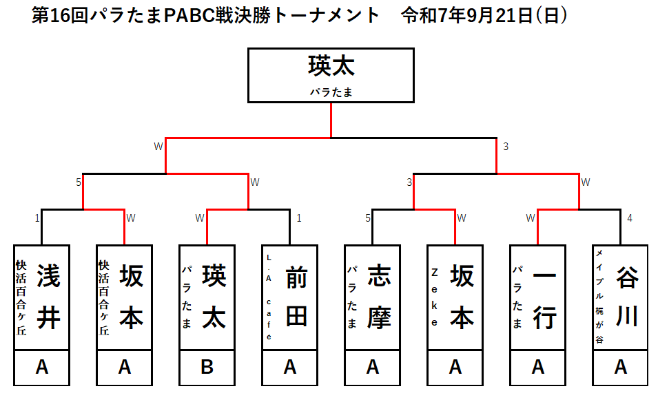 ※最後の写真を撮り忘れてしまいましたので今回は写真無しです 申し訳ありません 今回も沢山の方々にご参加いただき誠にありがとうございました おかげさまでフルエントリーでした …僕もちょっと撞きたかったです 山梨、埼玉、千葉、東京、 色んな所からご参加いただきました …ありがたや〜 今回も多くのドラマがあり、予想もしていなかった展開が繰り広げられ、最後は15名もの人達に見守られての決勝戦 そんな熱いトーナメントの結果は以下の通りです ↓ ↓ ↓ 優勝:瑛太さん(B:パラたま) 準優勝:一行さん(A:パラたま) 3位:坂本さん(A:快活百合ヶ丘店) :坂本さん(A:Zeke) 5位:前田さん(A:L.A cafe) :谷川さん(A:メイプルハウス梶が谷) :浅井さん(A:快活百合ヶ丘店) :志摩さん(A:パラたま) でした〜 優勝の瑛太さん、 中学1年生で球歴1年半の瑛太さんですが、伸びやかなストロークとテンポの良さでバシバシ入れる見ていて気持ちの良いスタイル ベスト8では強敵前田さん相手に持ち味全開のバチバチモードでした とはいえまだB級の瑛太さん、準決勝では一転して空回りモードに 最後の最後に坂本さんのまさかのミスに助けられて絶体絶命の場面を乗り越えられてました 神にも愛されてる瑛太さん、これからの成長が楽しみで仕方ありません 準優勝の一行さん、 準決勝で力尽きることが多い一行さんが遂に決勝戦へ …でしたが、決勝戦はナイスショットが出てはいたものの複数回のハイボールミスが痛かったですね 今回はいつもよりミスが多めに出てしまいましたが、次回の決勝戦ではキッチリ入れきってくださるはずです 次回の活躍を楽しみにしてます 今回の決勝戦はパラたま対決となり、タイミング良く多くの常連様達に見守られた熱い戦いとなりました 次回も多くの方々にご参加いただき楽しいトーナメントになることを心より願っております ![]() 2025.8.24(日) 第6回パラたまBC戦 試合結果