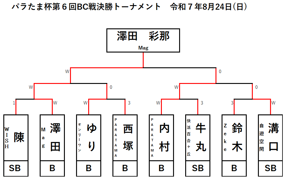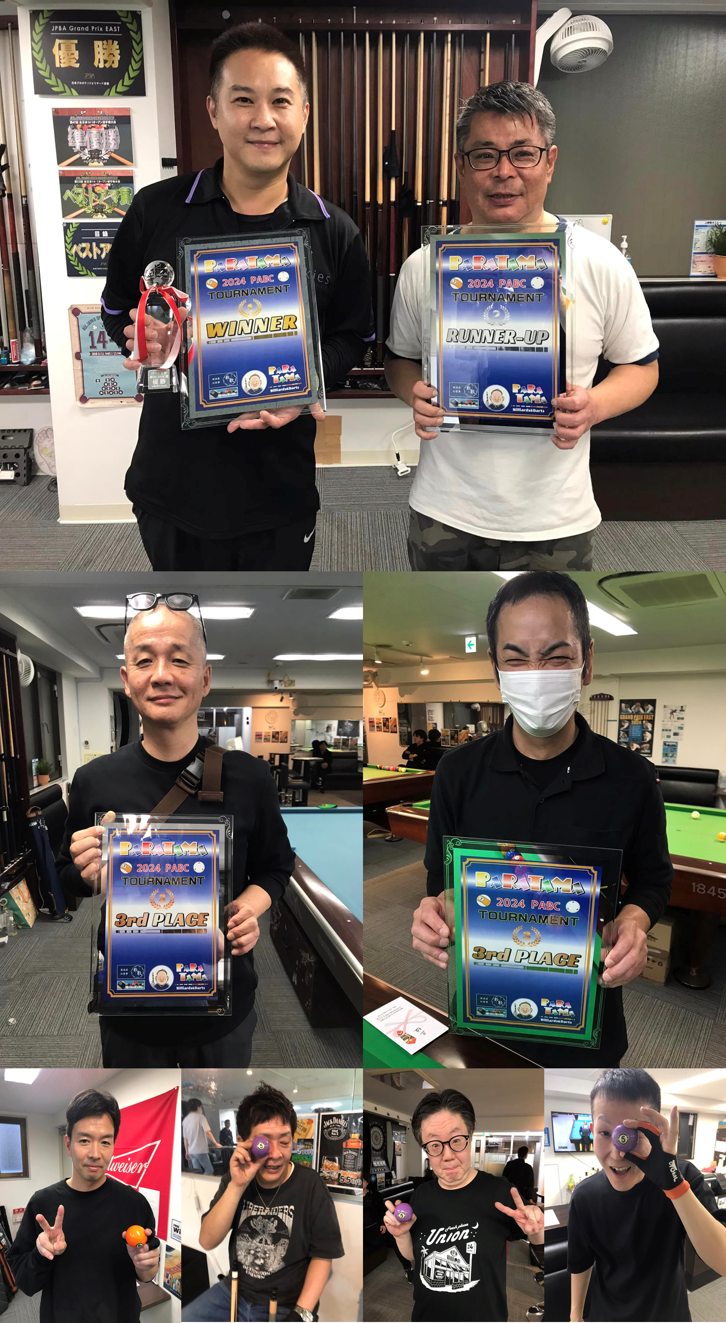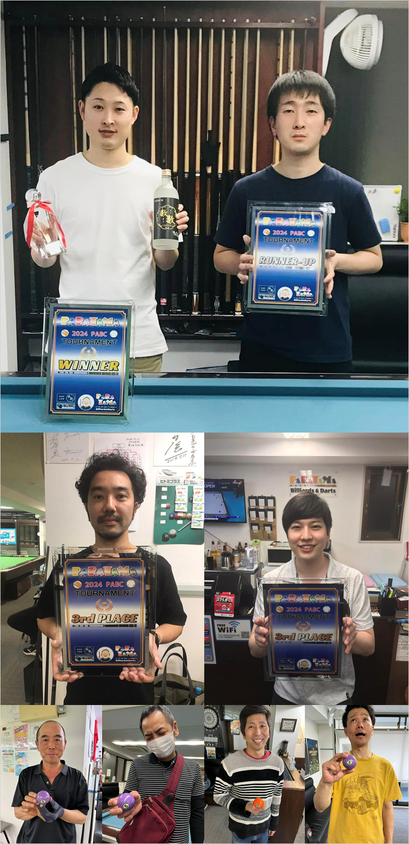 ※最後の写真を撮り忘れてしまいましたので今回は写真無しです 申し訳ありません 今回も沢山の方々にご参加いただき誠にありがとうございました おかげさまでフルエントリーでした …僕もちょっと撞きたかったです 山梨、埼玉、千葉、東京、 色んな所からご参加いただきました …ありがたや〜 今回も多くのドラマがあり、予想もしていなかった展開が繰り広げられ、最後は15名もの人達に見守られての決勝戦 そんな熱いトーナメントの結果は以下の通りです ↓ ↓ ↓ 優勝:瑛太さん(B:パラたま) 準優勝:一行さん(A:パラたま) 3位:坂本さん(A:快活百合ヶ丘店) :坂本さん(A:Zeke) 5位:前田さん(A:L.A cafe) :谷川さん(A:メイプルハウス梶が谷) :浅井さん(A:快活百合ヶ丘店) :志摩さん(A:パラたま) でした〜 優勝の瑛太さん、 中学1年生で球歴1年半の瑛太さんですが、伸びやかなストロークとテンポの良さでバシバシ入れる見ていて気持ちの良いスタイル ベスト8では強敵前田さん相手に持ち味全開のバチバチモードでした とはいえまだB級の瑛太さん、準決勝では一転して空回りモードに 最後の最後に坂本さんのまさかのミスに助けられて絶体絶命の場面を乗り越えられてました 神にも愛されてる瑛太さん、これからの成長が楽しみで仕方ありません 準優勝の一行さん、 準決勝で力尽きることが多い一行さんが遂に決勝戦へ …でしたが、決勝戦はナイスショットが出てはいたものの複数回のハイボールミスが痛かったですね 今回はいつもよりミスが多めに出てしまいましたが、次回の決勝戦ではキッチリ入れきってくださるはずです 次回の活躍を楽しみにしてます 今回の決勝戦はパラたま対決となり、タイミング良く多くの常連様達に見守られた熱い戦いとなりました 次回も多くの方々にご参加いただき楽しいトーナメントになることを心より願っております ![]() 2025.8.24(日) 第6回パラたまBC戦 試合結果