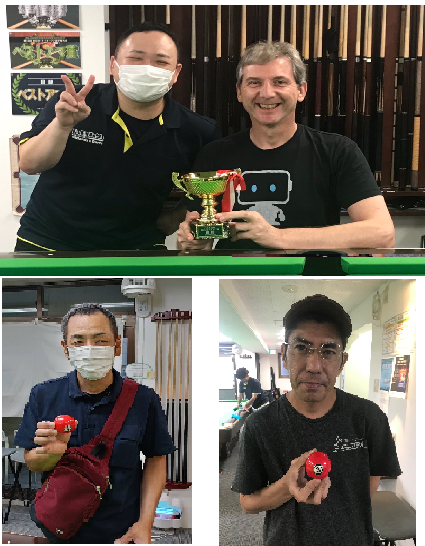 今回も遠方からも多くの方々にご参加いただきありがとうございました 今回の運営はスタッフI君が運営お手伝いを頑張ってくれたおかげで進行がスムーズでした。 I君、ありがとうございます。 次回以降もしっかり頼らせていただくつもりですので、よろしくお願いしますw さて、結果発表です ↓ ↓ ↓ 優勝:渡辺さん(快活練馬店) 準優勝:市川さん(バグース町田店) 3位:溝口さん(自遊空間君津店) :古田島さん(セスパ) 5位:畠山さん(PARATAMA) :飯尾さん(PARATAMA) :村井さん(Be-one) :碓井さん(PARATAMA) 優勝の渡辺さん、 全体的に一番飄々と取り切っておられた印象でした また、古墳台だけは入らないと割り切ってたそうで、 シュートミスが出ても慌てず落ち着いて次のチャンスに向かっておられて メンタルマネージメントの強さが勝利に結び付いたのではないかと思いました 次回連覇を目指して是非またエントリーお願いしたいですね 準優勝の市川さん、 朝一の試合から大苦戦しつつもコツコツ丁寧に積み重ねての決勝戦進出 最後は要所でのミスが響きましたが、初出場での決勝戦進出は素晴らしいですね 次回は優勝目指して頑張っていただきたいです 今回は、全体的にヒルヒルがとても少なくて進行が早く進み、過去の大会で1番早く終わった時よりも45分も早く終わりました まさかの19時過ぎの終了です ありがたや〜 次回のBC戦は年明けて2月を予定しております。 皆様のご参加を心よりお待ちしております |